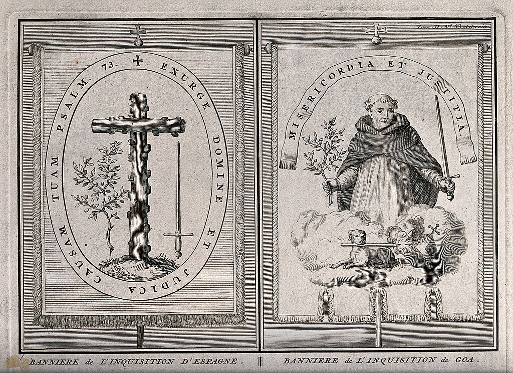 Left, the banner of the Spanish Inquisition; right, banner of the Goa Inquisition by the Portuguese.